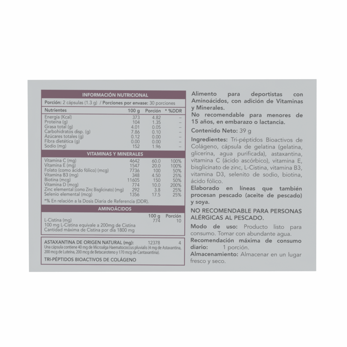 Una fórmula avanzada con tripéptidos de colágeno y astaxantina natural, diseñada para lograr una piel más firme, hidratada y protegida desde el interior.